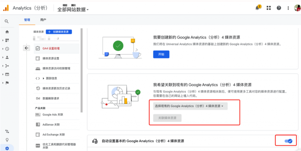 账户关联的操作在UA媒体资源设置,如下截图位置,选择需要关联的GA4账户,以及关闭下方的“自动设置基本的GA4媒体资源”选项,该步骤操作目的是为了防止在7月1日UA停止使用后,系统认为当前UA账户还没有创建对应的GA4账户,会自动额外为您创建一个。