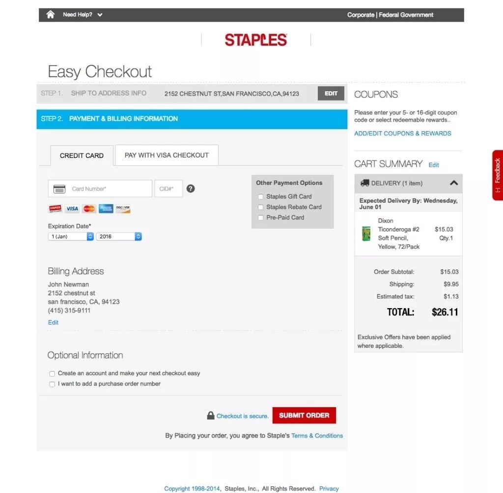 在结账时,有许多用户并没有继续完成,选择了放弃,因为他们不想与网站分享任何关于自己的额外的信息,用户会认为这可能会侵犯他们的隐私。因此,只问一些与订单达成相关的问题便是极好的一种选择,并且尝试将与产品相关或与应付金额相关的问题组合在一起,这样用户就可以放心地回答你。