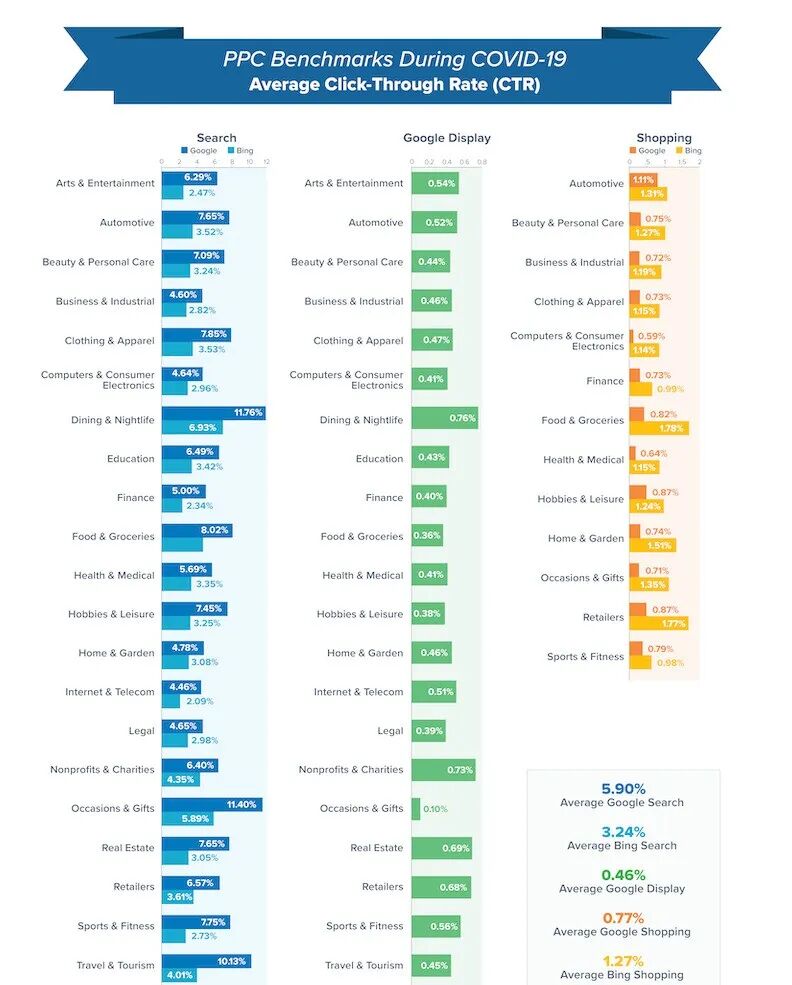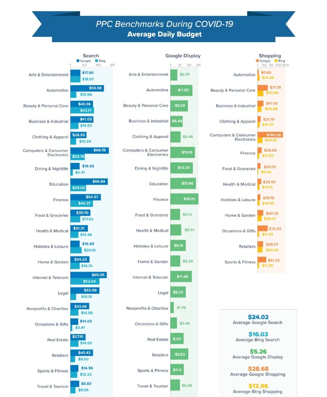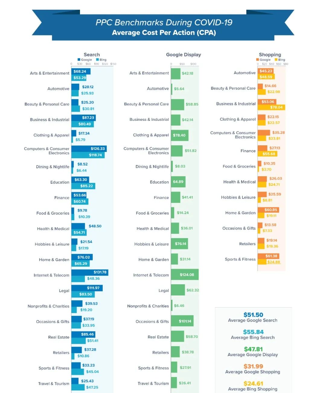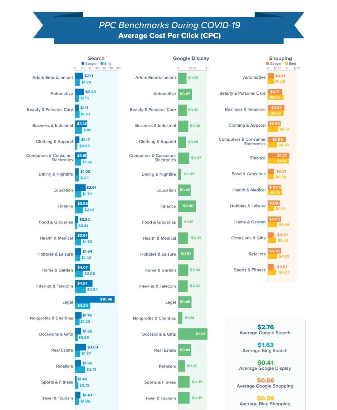 (数据主要包括PPC(按每次点击付费)指标中的21个行业平均值:艺术与娱乐,汽车,美容与个人护理,商业与工业,服装与服饰,计算机与消费电子产品,餐饮与夜生活,教育,金融,食品与百货,保健与医疗,休闲娱乐,家居与园艺,互联网,法律,公益与慈善,礼品,房地产,零售商,体育与健身以及旅游。费用均以美元为单位。)