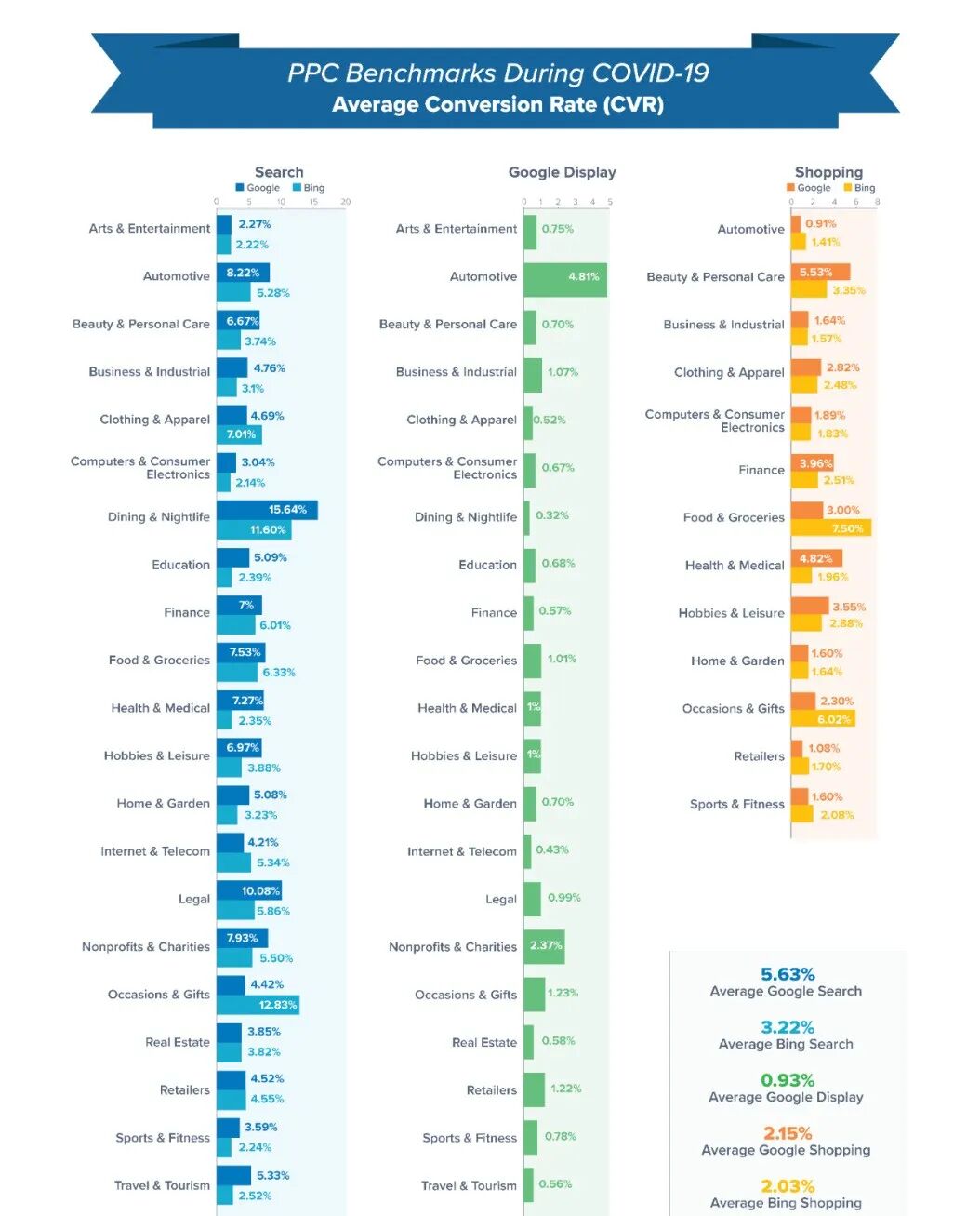 下面本文将分享基于分析以下数据所得的各行业的Google ads基准(基于Google搜索、购物、展示广告、Bing搜索、购物广告),跨境电商企业可以参考对比自己的广告投放数据,以便及时对广告系列做出相应调整。