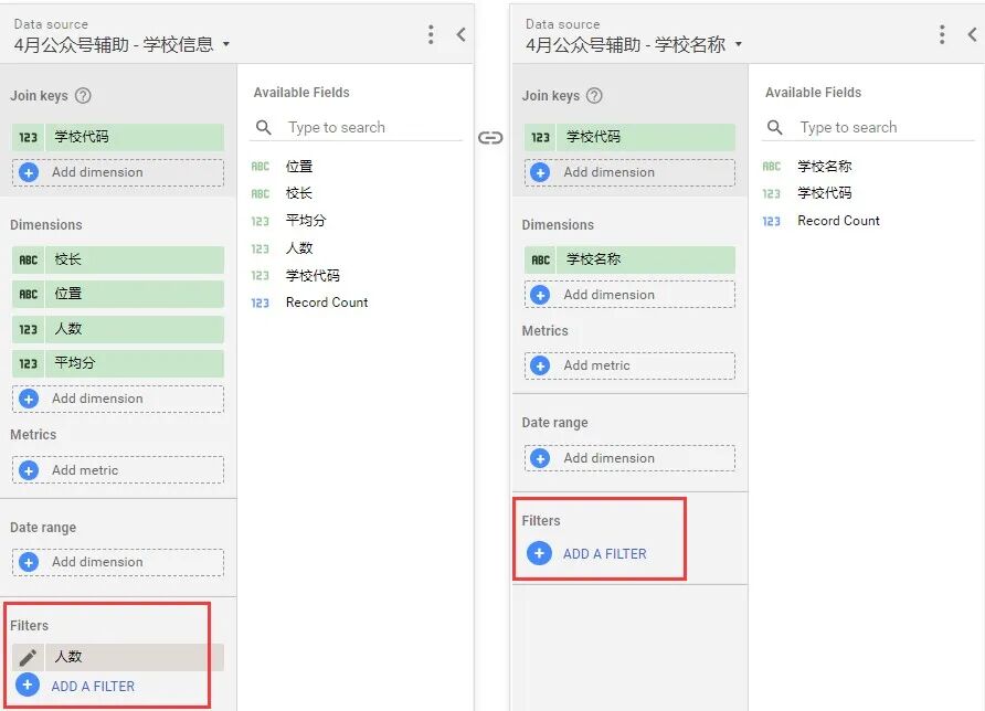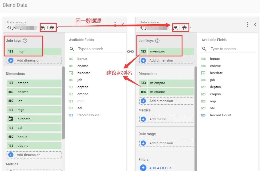 注:当连接的数据源相同时,建议起别名,用不同的名称对相同的字段进行区分。如不起别名,会在制表选择维度时混淆各维度,进而导致拉取数据混乱。