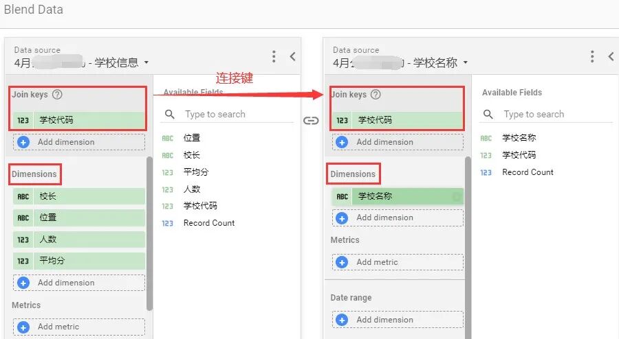 3.点击Blend Data,连接另一数据源,选择Join keys,并选择表格中可以选择的Dimensions —— Save