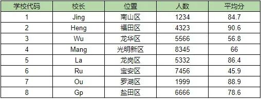 4.使用创建好的混合数据查看各个学校代码对应学校名称的人数和平均分等信息。