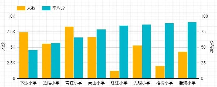 需求:展示各学校的平均分,人数对比情况(以学校名称为维度)