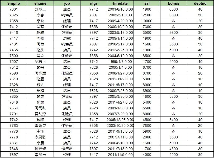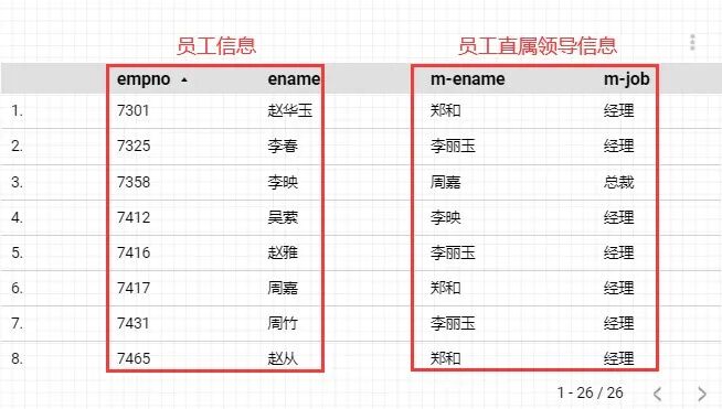 4.数据呈现(显示各个员工的编号、姓名及直属领导的姓名和职位)