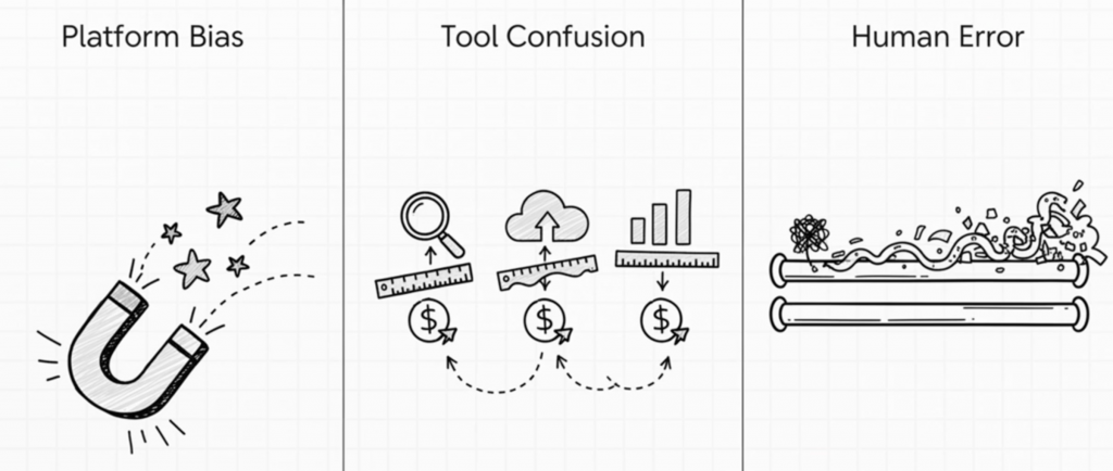 结果,所有平台的报告都自洽且表现优秀,决策者被困在平台的“囚徒困境”中:信任 A 就要怀疑 B,信任 B 就要否定全局。这不是增长,而是统计幻觉。