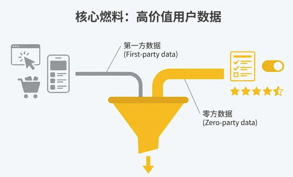 • 零方数据 (Zero-party data):用户通过调查、偏好中心等渠道主动、自愿共享的信息。这类数据具有极高的准确性和可靠性,是无 Cookie 时代最重要的补充资产。