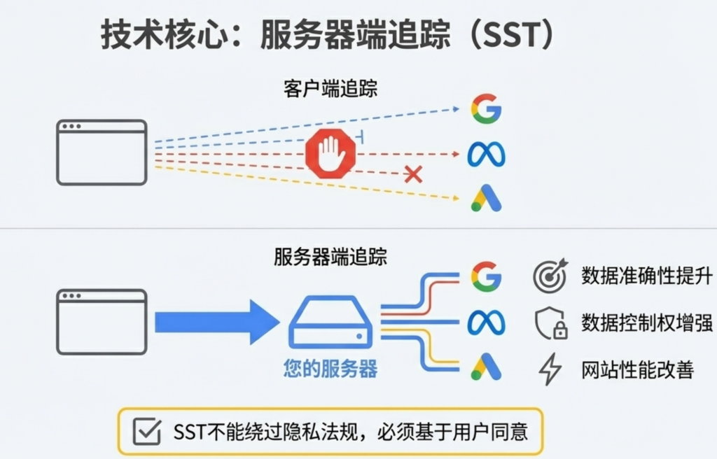 服务器端追踪(Server-Side Tracking,SST)改变了数据的流动方式,是应对浏览器限制的技术关键。