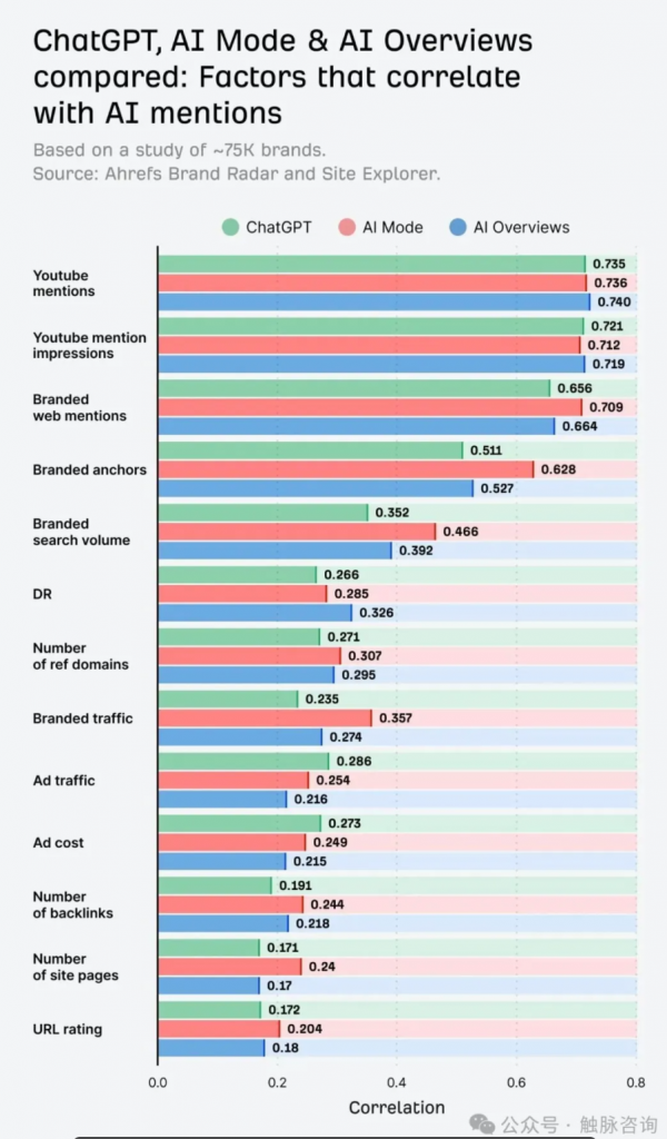 多模态 AI 时代,视频文本(Transcript)是 AI 抓取的金矿。一项针对 7.5 万个品牌的研究表明,YouTube 提及度与 AI 可见度之间的相关性高达 0.74,是所有单一因素中最强的。